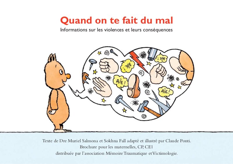 Texte de Muriel Salmona et Sokhna Fall adapté et illustré par Claude Ponti.Brochure pour les maternelles, CP, CE1 distribuée par l’association Mémoire Traumatique et Victimologie.